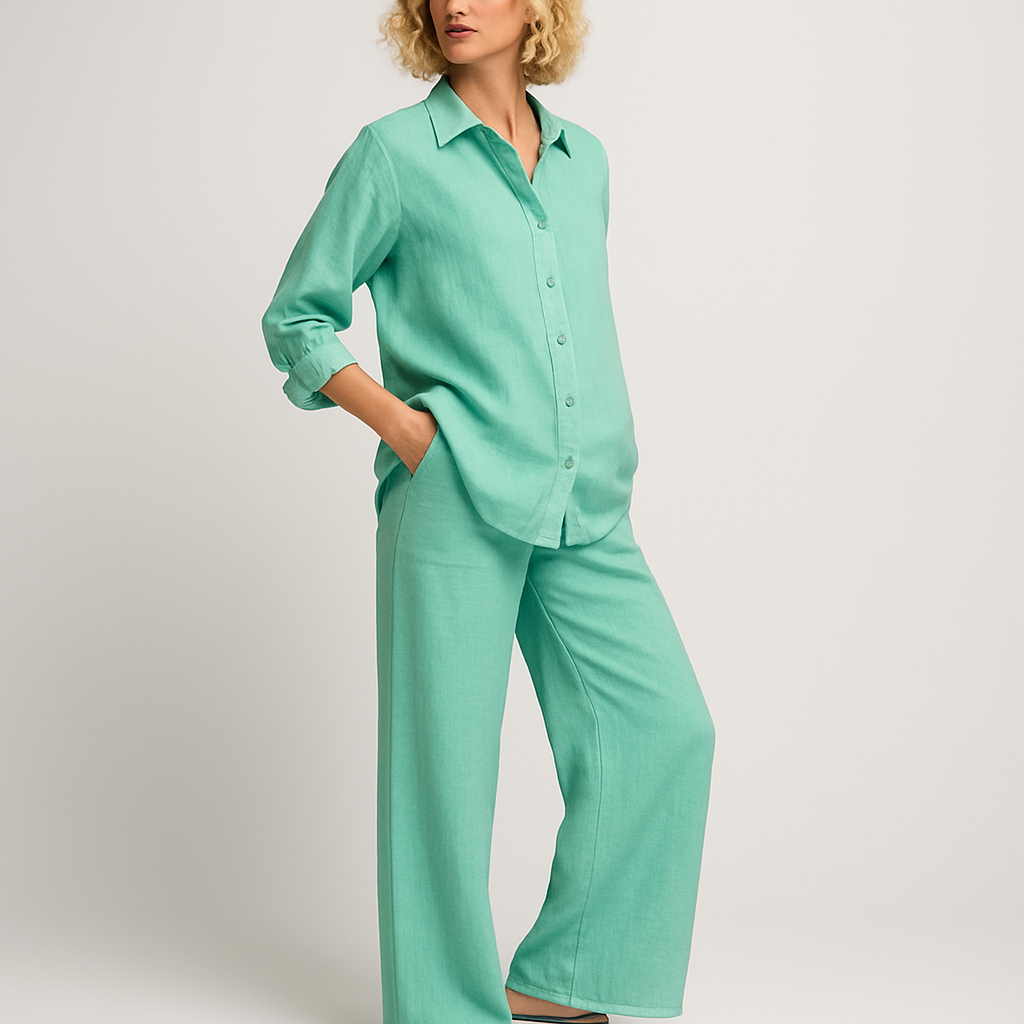 Ervaar moeiteloze elegantie met het LeRoxy damespak, gemaakt van een luchtige katoen-linnenmix. Dit tweedelige pak – bestaande uit blazer/top en broek – is ontworpen voor moderne vrouwen die stijl en comfort willen combineren, of je nu naar kantoor gaat, uit eten gaat of ontspannen je dag doorbrengt.