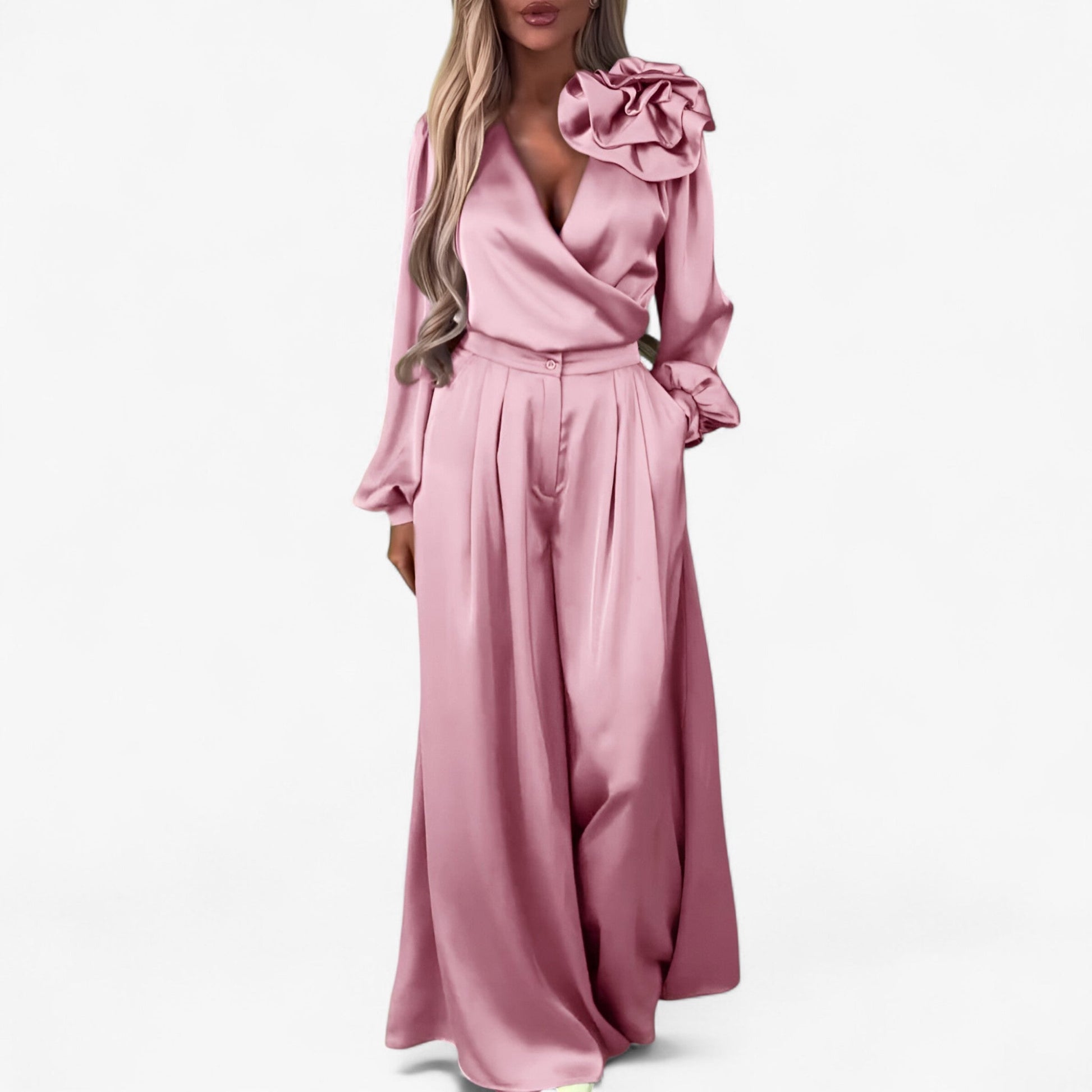 Ontdek deze stijlvolle en comfortabele damesset, perfect voor de moderne vrouw die houdt van veelzijdige mode. De set bestaat uit een zachte polyester top met een flatterende V-hals en subtiele 3D-bloemdetails, gecombineerd met een wijde broek met plooien en handige zakken. Ideaal om moeiteloos elegante of casual looks te creëren, of je nu naar een brunch, kantoor of een avondje uit gaat.