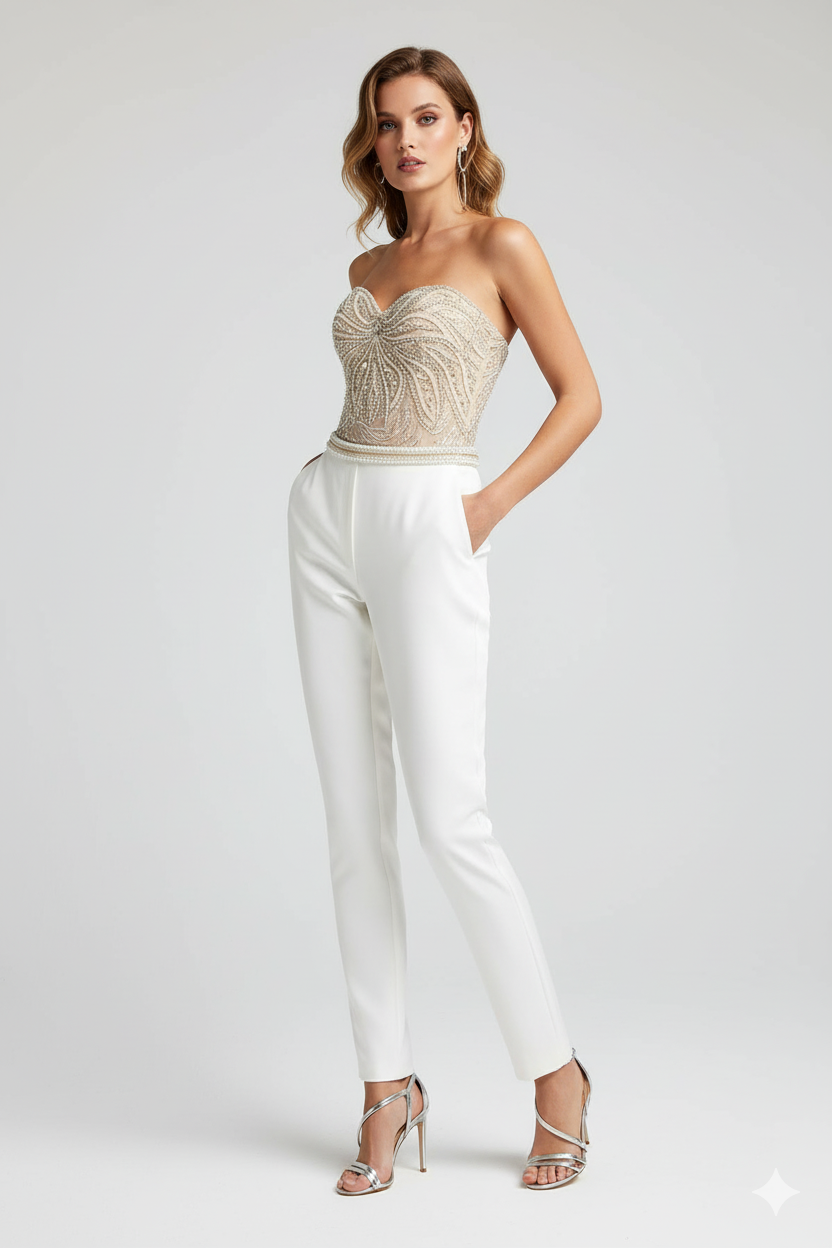 Stap moeiteloos in de spotlight met de Elegante Jumpsuit. Deze stijlvolle jumpsuit combineert verfijning en comfort en is dé keuze voor elke speciale gelegenheid. Het strapless ontwerp en de wijde broek creëren een flatterende, moderne look terwijl de lichte, vloeiende stof ultiem draagcomfort biedt. Perfect voor feesten, diners of andere feestelijke evenementen, en beschikbaar in tijdloze, elegante kleuren.