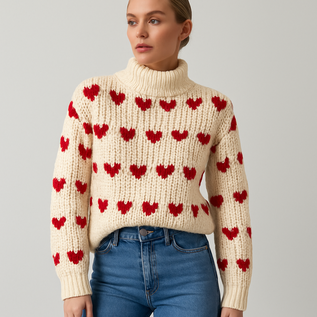 Voeg een vrolijke en knusse touch toe aan je herfst- en wintergarderobe met de LeRoxy trui. Gemaakt van zacht acrylmateriaal voelt deze trui comfortabel en behaaglijk aan, ideaal voor frisse dagen. Het speelse rode hartjespatroon geeft je outfit een vrouwelijke twist, terwijl de hoge ribkraag en lange mouwen extra warmte en comfort bieden. Perfect om casual te dragen of chic te stylen met jeans, leggings of rokken.