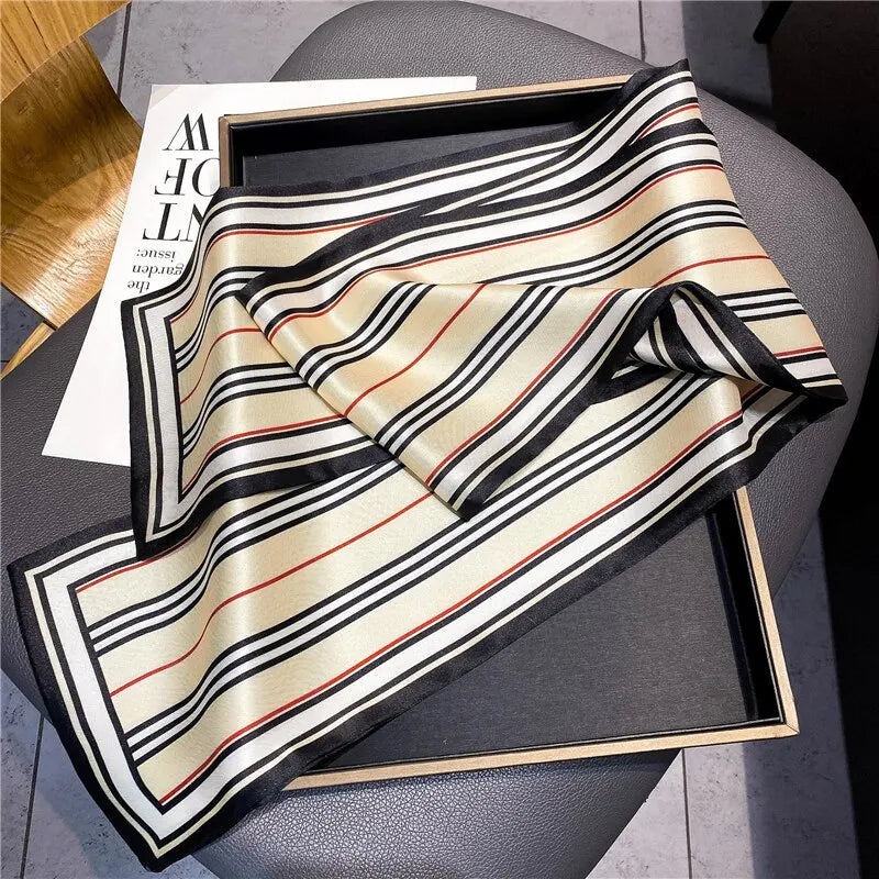 Verhoog je look met de LeRoxy zijden sjaal: een luxe, dunne sjaal van 100% zijde met een opvallende gestreepte print. Dit veelzijdige accessoire is perfect als nekstrik, hoofdband, polsband of bandana en brengt een frisse, kleurrijke touch aan elke outfit. Ideaal voor lente en zomer, ontworpen voor de moderne vrouw die stijl en comfort wil combineren.