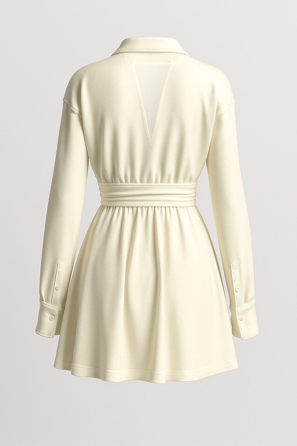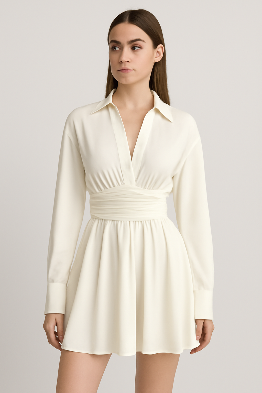 Ontdek deze elegante ivoorkleurige chiffon mini-shirtjurk, perfect voor moderne vrouwen die stijl en comfort willen combineren. Gemaakt van lichtgewicht 100% polyester chiffon voor een luchtige en luxe uitstraling. De flatterende, getailleerde pasvorm accentueert je silhouet, terwijl de lange mouwen en horizontale zijrits een eigentijdse touch geven.