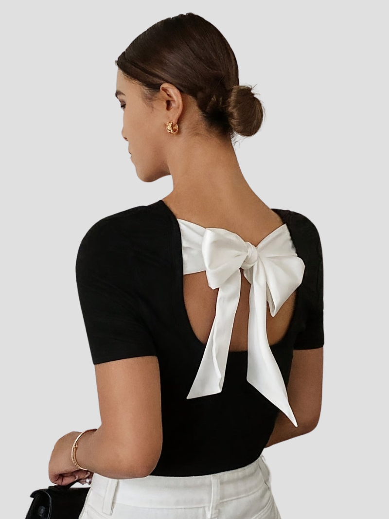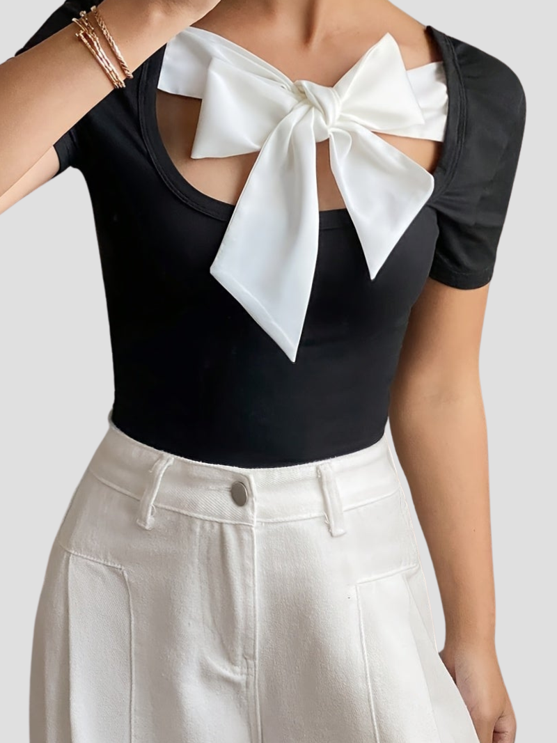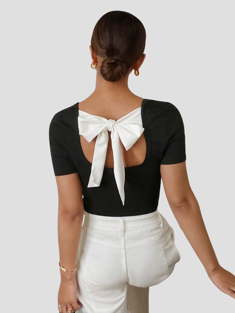 Elegant Strikdetail: Het opvallende witte strikje geeft een unieke en vrouwelijke touch aan deze zwarte zomer top.